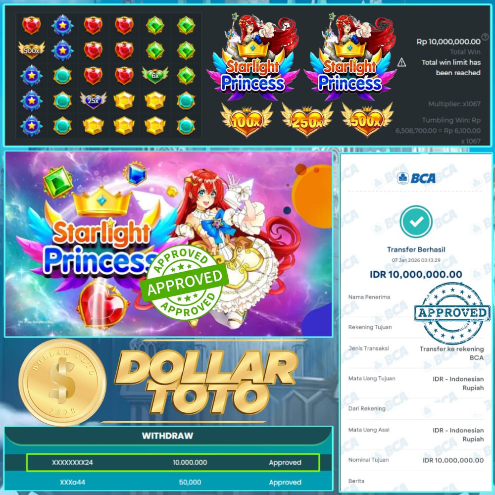 Selamat kepada member DOLLARTOTO dengan Username XXXXXXX76 yang berhasil meraih kemenangan besar di permainan Starlight Princess – Pragmatic Play.