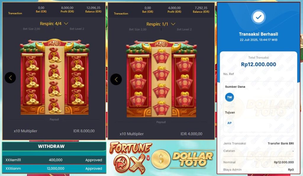 Selamat Kepada Member DOLLARTOTO dengan Username XXXem111 Yang Beruntung Mendapatkan Kemenangan Besar di DOLLARTOTO Dalam Permainan FORTUNE OX >> PG SOFT. Dengan Jumlah Kemenangan Yang Diraih Sebesar Rp. 12.000.000,- yang langsung dibayar hingga tuntas.