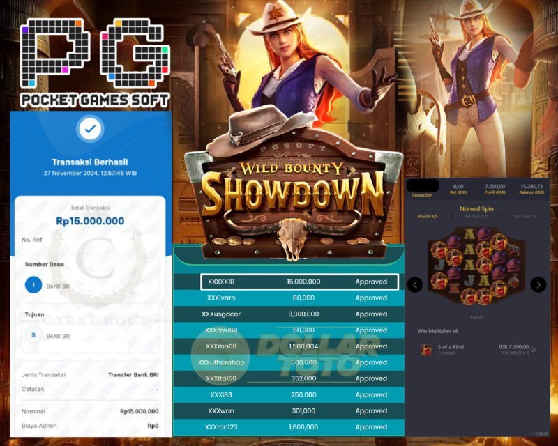 Selamat kepada bosku yang bermain di DOLLARTOTO dengan user id XXXXXXXXX00 yang telah mendapatkan kemenangan besar di game WILD BOUNTY SHOTDOWN >> PG SOFT