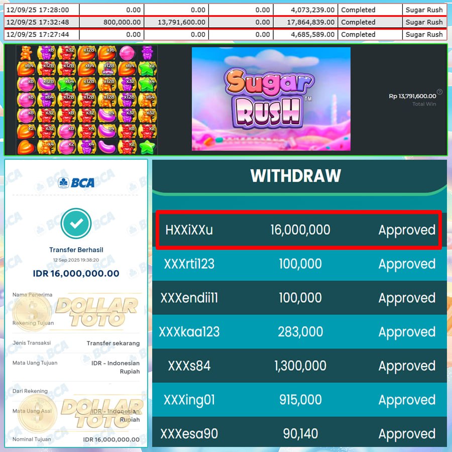 SELAMAT UNTUK MEMBER DOLLARTOTO dengan Username : XXXXXau berhasil meraih kemenangan besar di permainan SUGAR RUSH – PRAGMATIC PLAY SLOT.