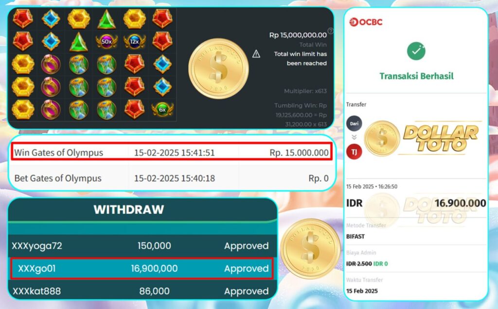SELAMAT KEPADA MEMBER DOLLARTOTOUSER ID XXXgo01 YANG TELAH MENDAPAT KEMENANGAN BESAR DI GAME GATES OF OLYMPUS DARI PROVIDER PRAGMATIC PLAY.