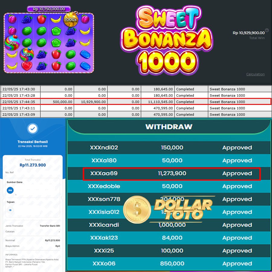 Selamat kepada member DOLLARTOTO, user id XXXAA69 Yang Telah Mendapatkan Kemenangan Besar di Permainan SWEET BONANZA 1000 >> PRAGMATIC PLAY SLOT.