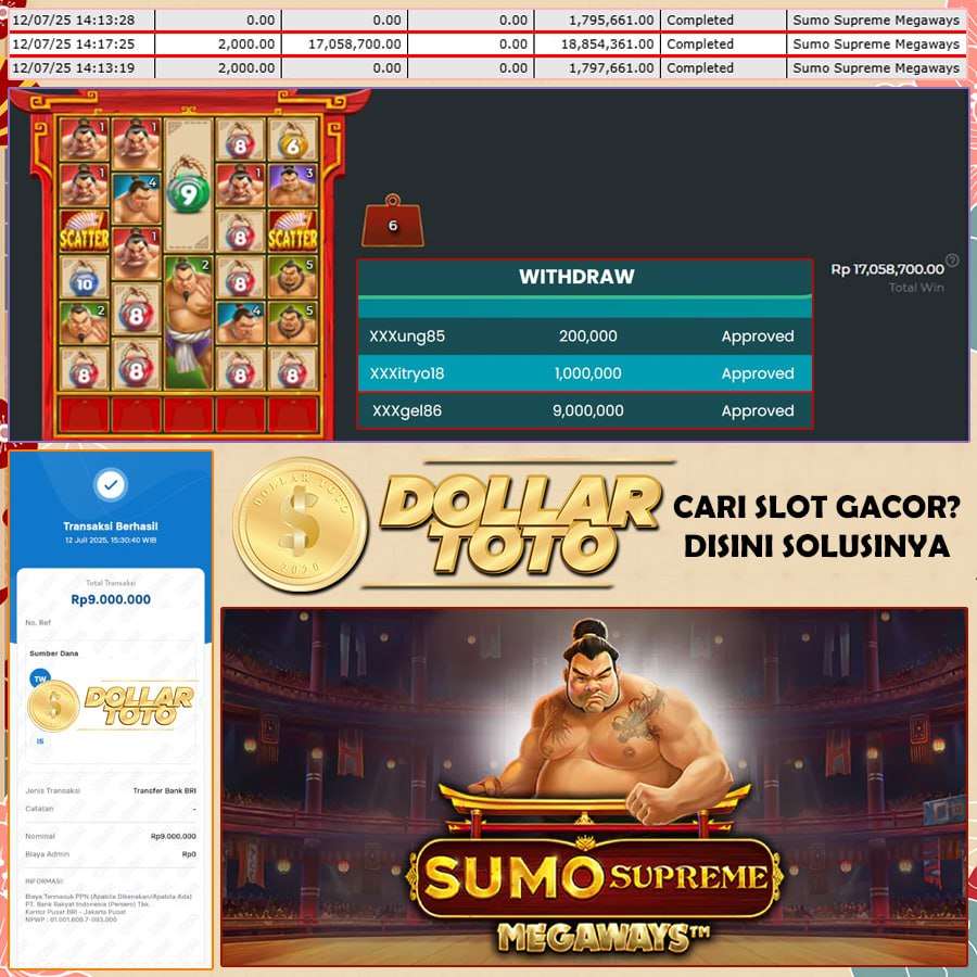 Selamat Kepada Member DOLLARTOTO dengan Username XXXgel86 Yang Beruntung Mendapatkan Kemenangan Besar di DOLLARTOTO Dalam Permainan SUMO SUPREME MEGAWAYS PRAGMATIC PLAY SLOT. Dengan Jumlah Kemenangan Yang Diraih Sebesar Rp. 9.000.000,- yang langsung dibayar hingga tuntas. Bagi Bosku Yang Ingin Mendapat Kemenangan Puluhan Juta. Bisa Langsung Segera Mendaftar