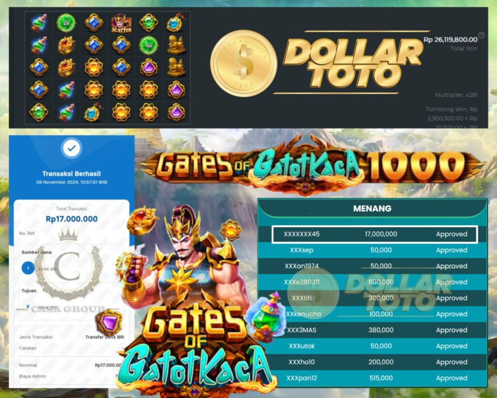 SELAMAT KEPADA MEMBER DOLLARTOTO, USER ID : XXXXXXX45, MENANG DI GAME PRAGMATIC SLOT > GATES OF GATOT KACA 1000.