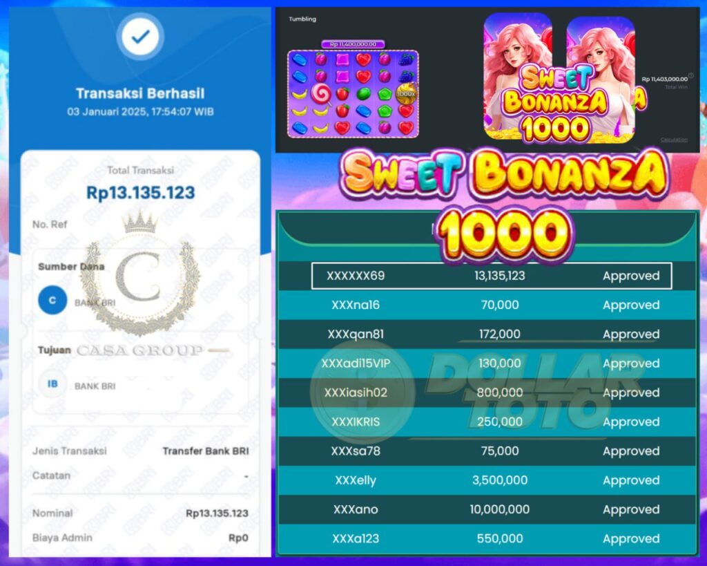 SELAMAT KEPADA MEMBER DOLLARTOTO, USER ID : XXXXXX69, MENANG DI GAME PRAGMATIC PLAY > SWEET BONANZA 1000
