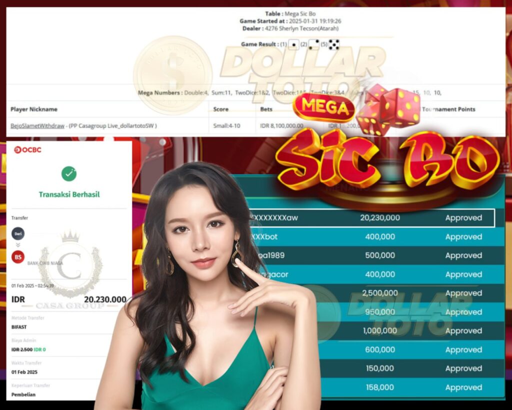 SELAMAT KEPADA MEMBER DOLLARTOTO, USER ID : XXXXXXXXXXXXXAw, MENANG DI GAME PRAGMATIC LIVE CASINO  MEGA SICBO