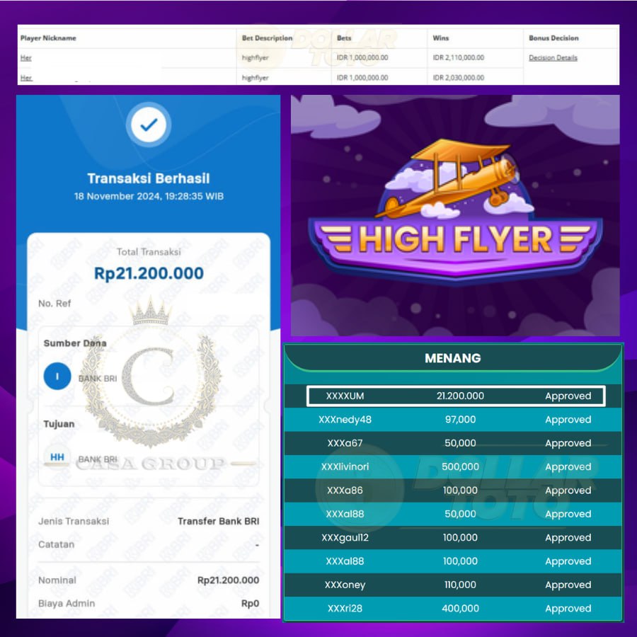Selamat kepada member kami di DOLLARTOTO > USER ID XXXXXUM yang telah mendapatkan kemenangan besar pada permainan HIGH FLAYER.