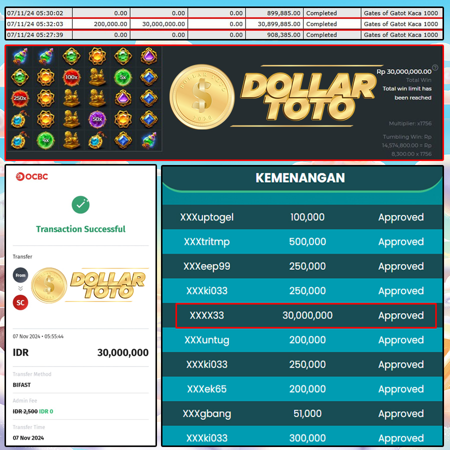 SELAMAT KEPADA MEMBER DOLLARTOTO, USER ID : XXXX33, MENANG DI GAME PRAGMATIC SLOT > GATES OF GATOT KACA 1000