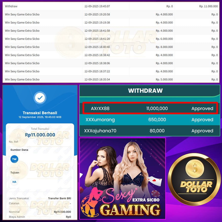 SELAMAT UNTUK MEMBER DOLLARTOTO dengan Username AXRXX88 berhasil meraih kemenangan besar di permainan SEXY LIVE – EXTRA SICBO – PRAGMATIC PLAY LIVE.