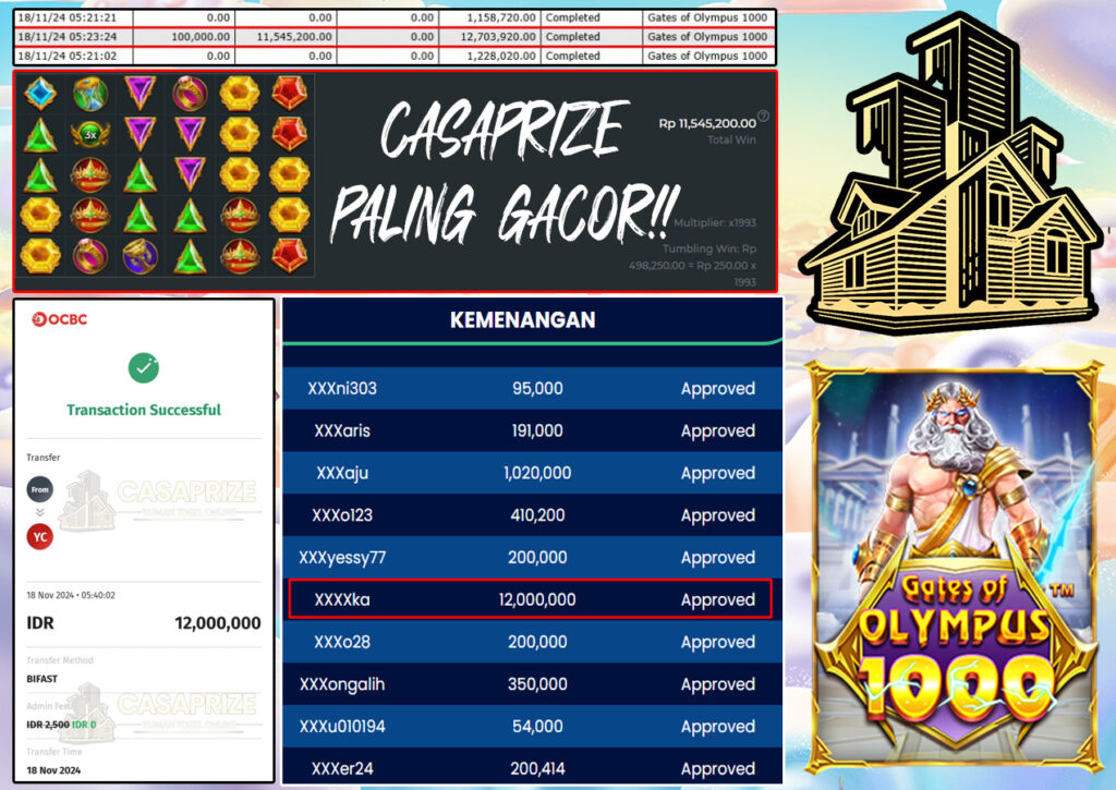 Selamat kepada bosku yang bermain di CASAPRIZE dengan user id XXXXka yang telah mendapatkan kemenangan besar di game GATES OF OLYMPUS 1000 > PRAGMATIC SLOT