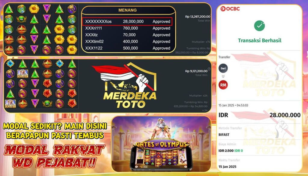 Selamat kepada bosku yang bermain di MERDEKATOTO dengan user id XXXXXXXXXos yang telah mendapatkan kemenangan besar di game GATES OF OLYMPUS > PRAGMATIC PLAY