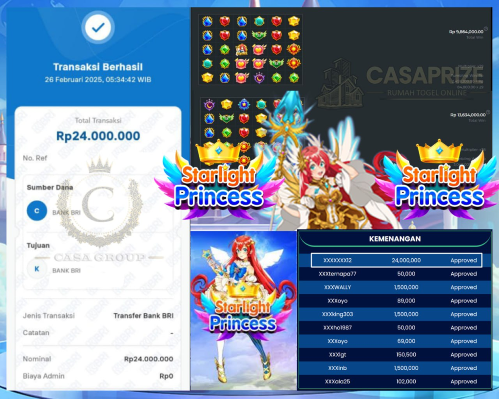 Selamat Kepada Member CASAPRIZE dengan User ID XXXXXXX12 yang Meraih Kemenangan Dari Game STARLIGHT PRINCESS.