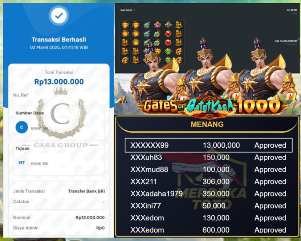 Selamat Kepada Member CASAGROUP dengan User Id XXXXXX99 Atas Kemenangan Besar dari Game GATES OF GATOTKACA 1000 – PRAGMATIC PLAY di MERDEKATOTO.
