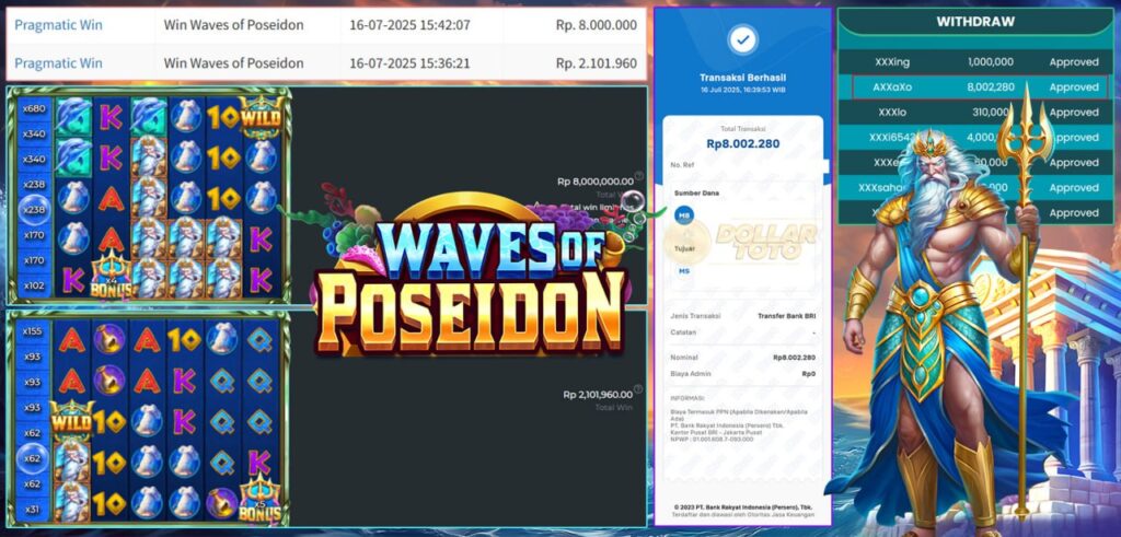 Selamat kepada bosku yang bermain di DOLLARTOTO dengan user id AXXaxo yang telah mendapatkan kemenangan besar di game TERBARU > WAVES OF POSEIDON > PRAGMATIC SLOT Untuk kemenangan sebesar Rp. 8.002.280 sudah berhasil kami proseskan secara lunas dan tuntas tanpa adanya basa basi