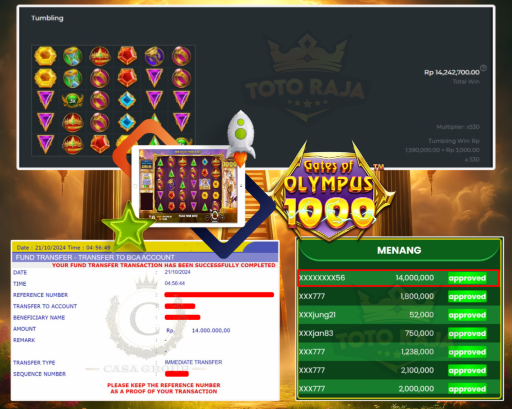 Selamat kepada bosku user id XXXXXXXXX56 yang telah mendapatkan kemenangan besar di TOTORAJA senilai Rp. 14.000.000 pada permainan Gates Of Olympus 1000.