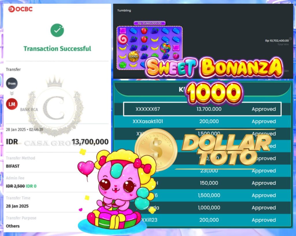 Selamat kepada bosku yang bermain di DOLLARTOTO dengan user id XXXXXX67 yang telah mendapatkan kemenangan besar di game SWEET BONANZA 1000!!⚡️ > PRAGMATIC SLOT