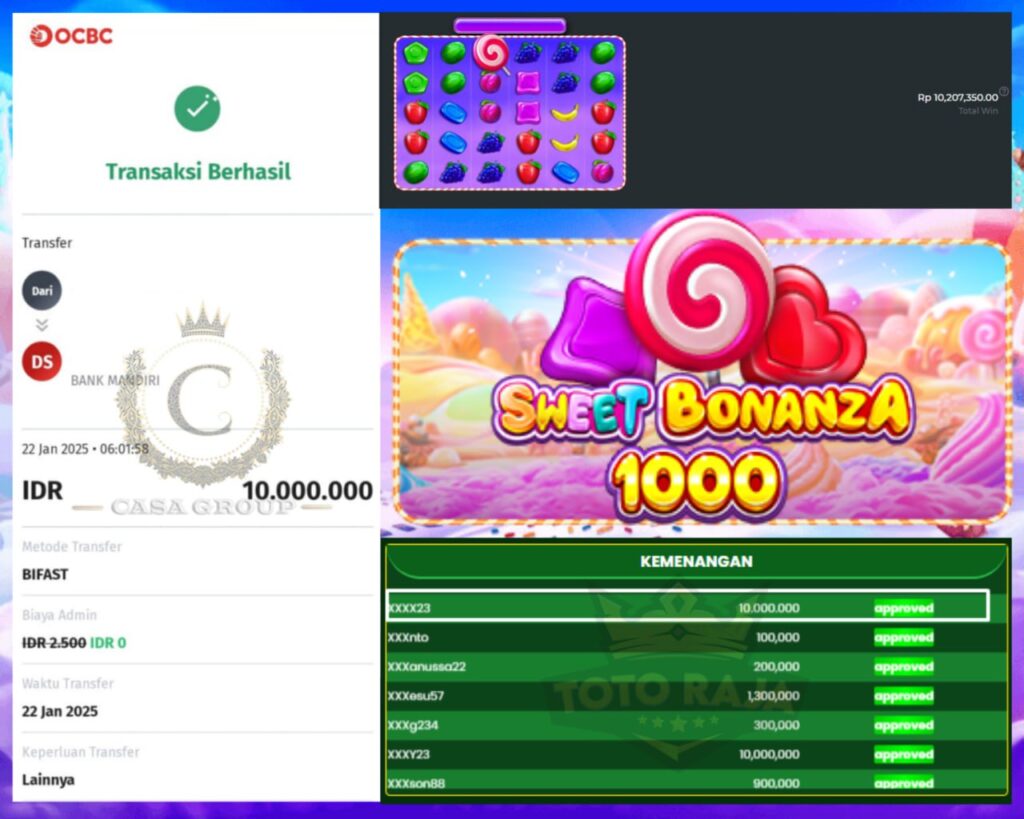 Selamat kepada bosku yang bermain di TOTORAJA dengan user id XXXX23 yang telah mendapatkan kemenangan besar di game SWEET BONANZA 1000!! > PRAGMATIC SLOT