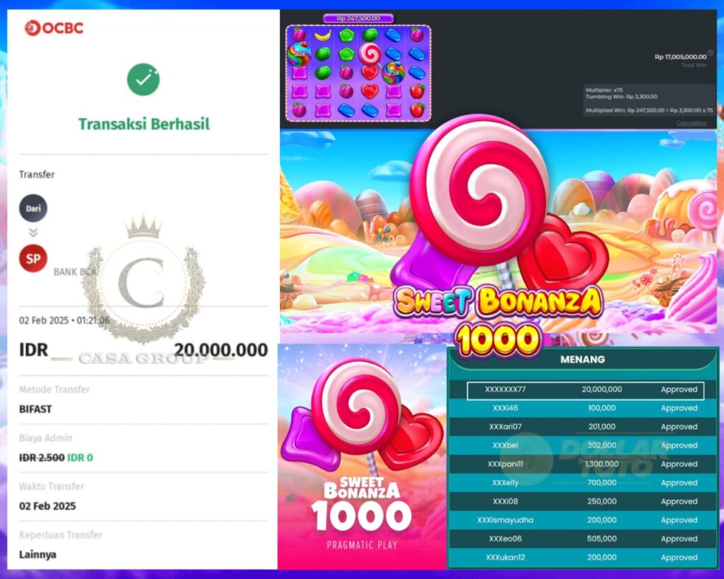 Selamat kepada member DOLLARTOTO user id XXXXXXX77 yang telah mendapatkan kemenangan besar di game PRAGMATIC PLAY >> SWEET BONANZA 1000