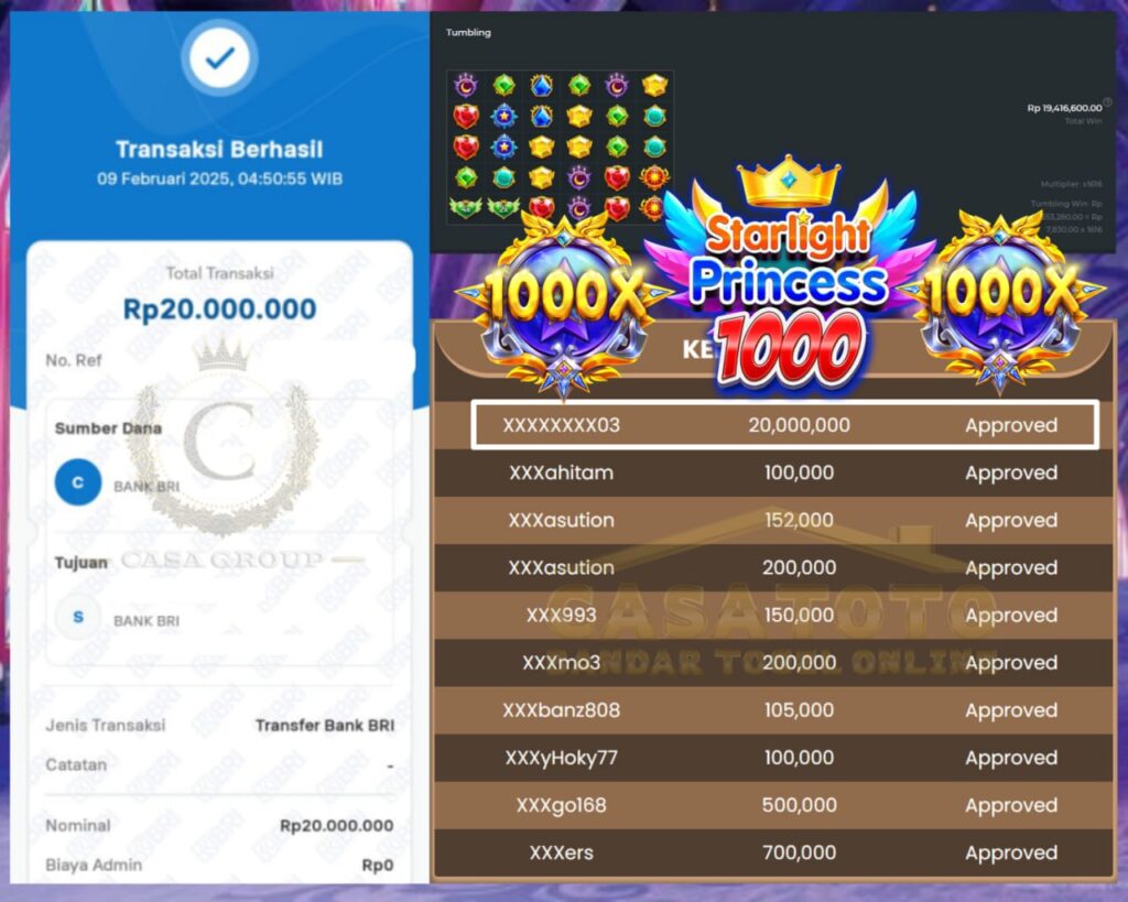 Selamat kepada bosku yang bermain di CASATOTO dengan user id XXXXXXXX03 yang telah mendapatkan kemenangan besar di game STARLIGHT PRINCESS 1000 > PRAGMATIC PLAY