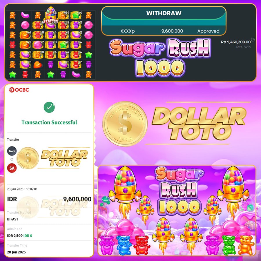 Selamat kepada bosku yang bermain di DOLLARTOTO dengan user id XXXXp yang telah mendapatkan kemenangan besar di game SUGAR RUSH 1000!!⚡️ > PRAGMATIC SLOT