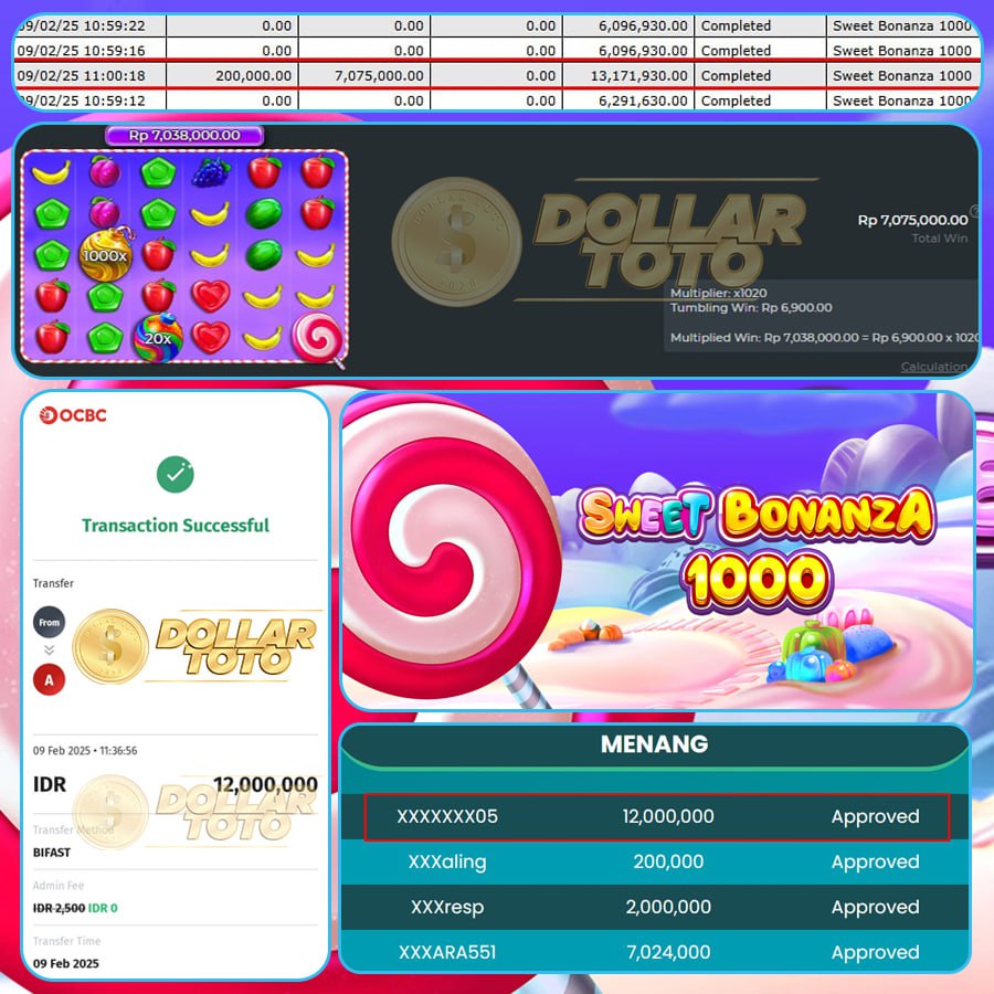 Selamat kepada member DOLLARTOTO user id XXXXXXXX05 yang telah mendapatkan kemenangan besar di game PRAGMATIC PLAY >> SWEET BONANZA 1000