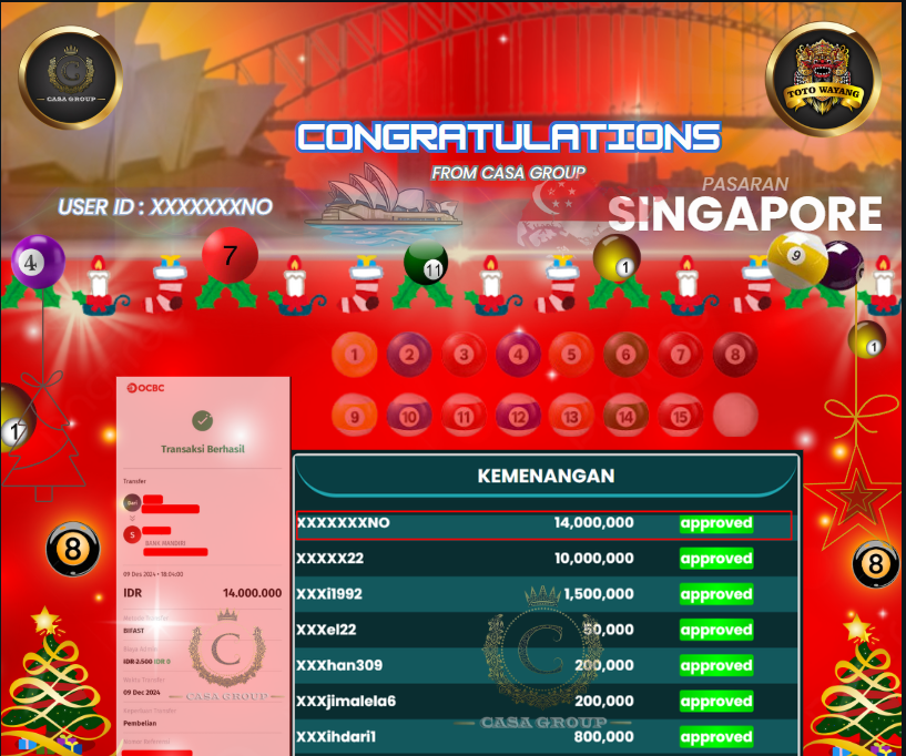 Selamat kepada user id XXXXXXXNO yang sudah mendapatkan hadiah dari pasaran SINGAPORE di situs totowayang