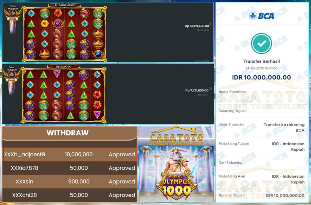 Selamat Kepada Member CASATOTO dengan Username XXXh_adjoest9 Yang Beruntung Mendapatkan Kemenangan Besar di Dalam Permainan GATES OF OLYMPUS 1000 >> PRAGMATIC PLAY SLOT.