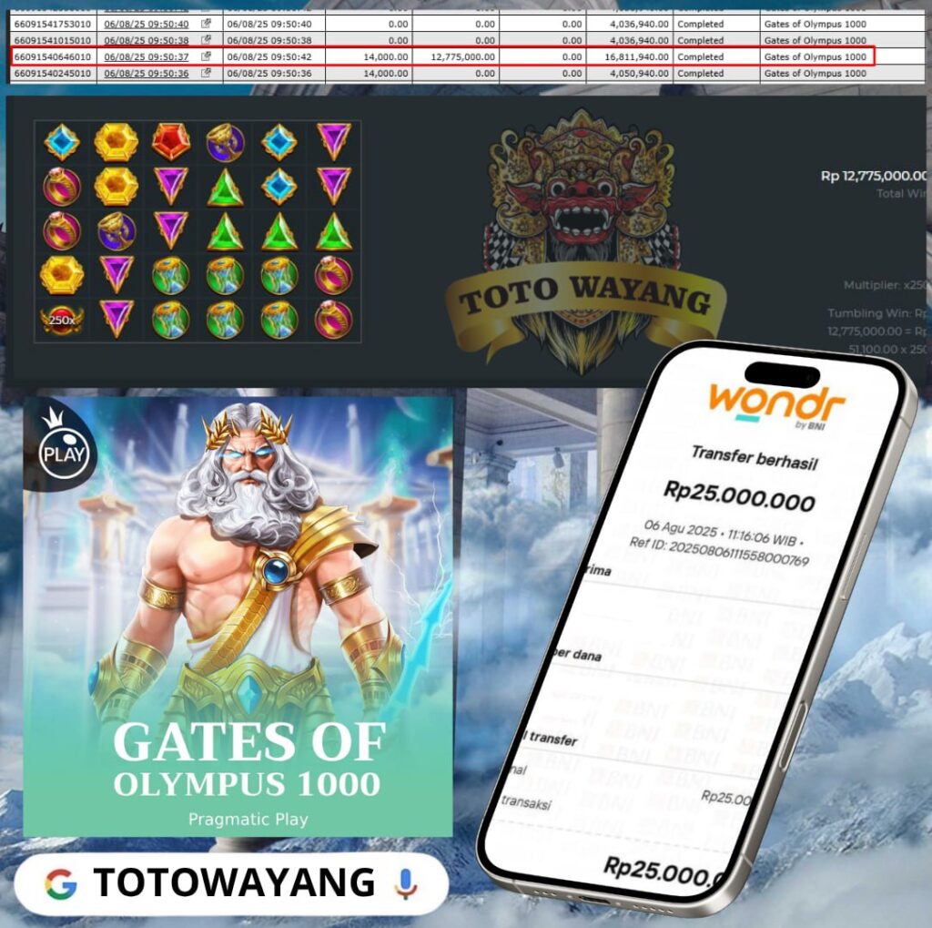 Selamat Kepada Member TOTOWAYANG dengan Username AxamqX Yang Beruntung Mendapatkan Kemenangan Besar di Dalam Permainan GATES OF OLYMPUS 1000 >> PRAGMATIC PLAY SLOT.
