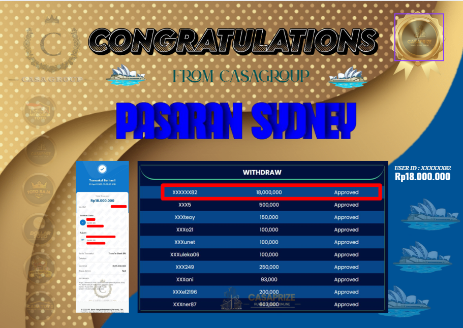 Selamat kepada User id XXXXXX82 yang sudah berhasil mendapatkan JACPOT besar dari hasil bet pasaran SYDNEY di situs casaprize dengan Total pencairan sebesar 18 juta langsung di bayar LUNAS tampa ada hambatan.