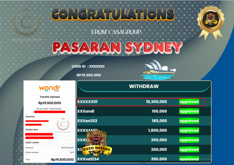 Luar biasa! user id xxxxx01 telah berhasil mendapatkan jackpot besar dari bet SYDNEY yang beruntung!