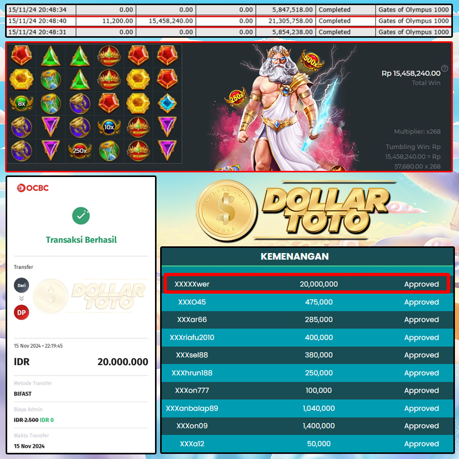 Selamat kepada bosku yang bermain di DOLLARTOTO dengan user id XXXXXwer  yang telah mendapatkan kemenangan besar di game PRAGMATIC SLOT >>GATES OF OLYMPUS