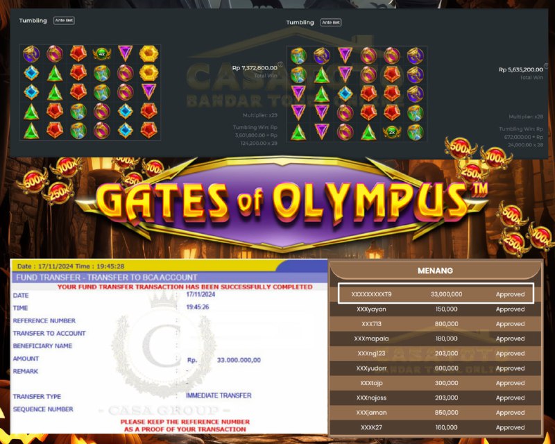 Selamat kepada bosku yang bermain di CASATOTO dengan user id XXXXXXXXXT9 yang telah mendapatkan kemenangan besar di game PRAGMATIC SLOT >>GATES OF OLYMPUS