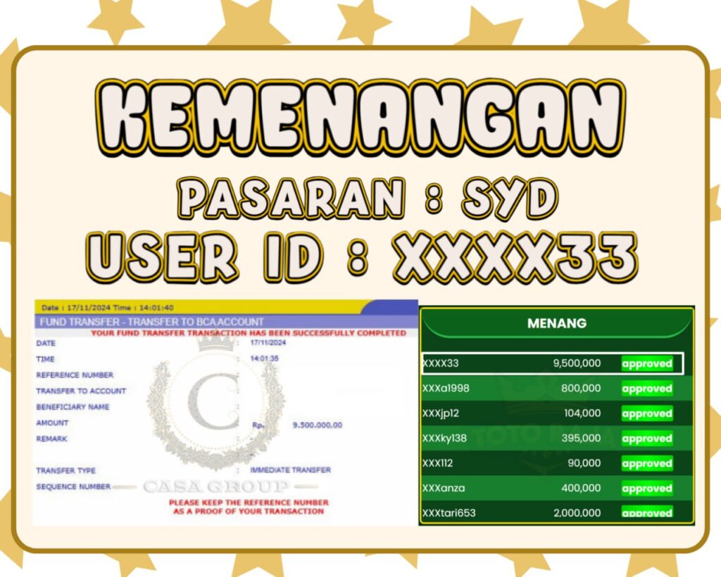 Selamat kepada User ID xxxx33 yang berhasil menang di pasaran SYDNEY