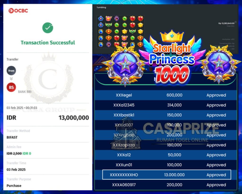 Selamat kepada bosku yang bermain di CASAPRIZE dengan user id XXXXXi84 yang telah mendapatkan kemenangan besar di game STARLIGHT PRINCESS 1000 > PRAGMATIC PLAY