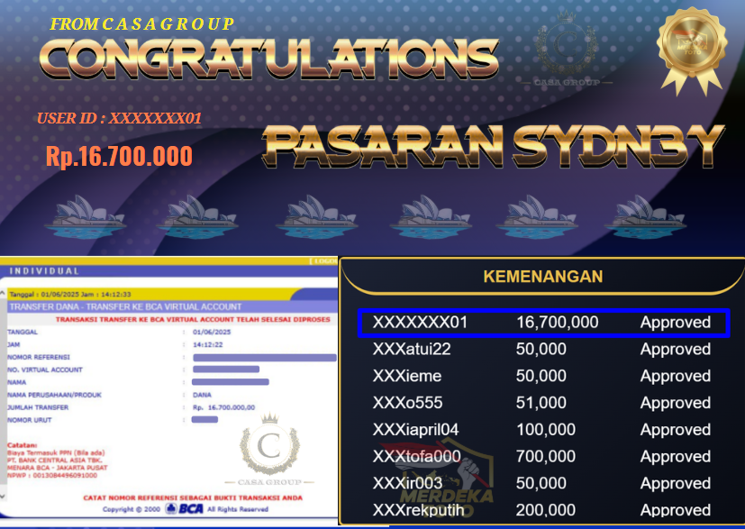 Selamat kepada User id XXXXXXXX01 yang sudah berhasil mendapatkan JACPOT dari hasil bet pasaran SYDNEY di situs merdekatoto dengan Total pencairan sebesar Rp.16.700.000 langsung di bayar LUNAS,
