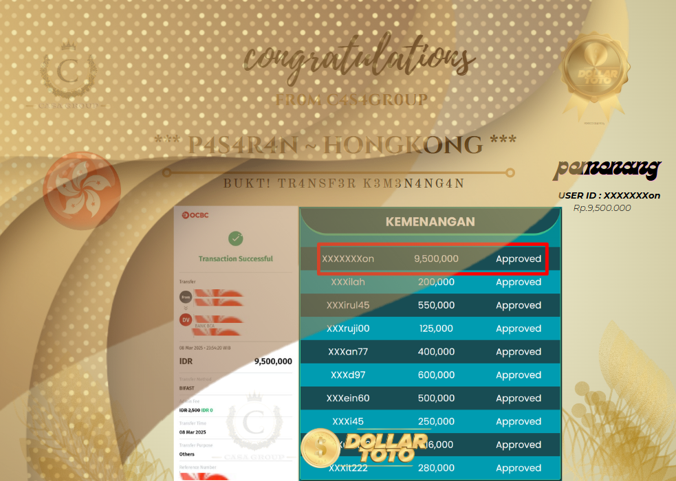 Selamat kepada User id XXXXXXXON yang sudah berhasil mendapatkan win besar dari hasil bet pasaran HONGKONG di situs dollartoto dengan Total pencaiaran sebesar 9,5 juta langsung di bayar LUNAS,bagi yang mau mendapatkan jp seperti user id ini yukk segera daftarkan akun baru nya di bawah ini >>