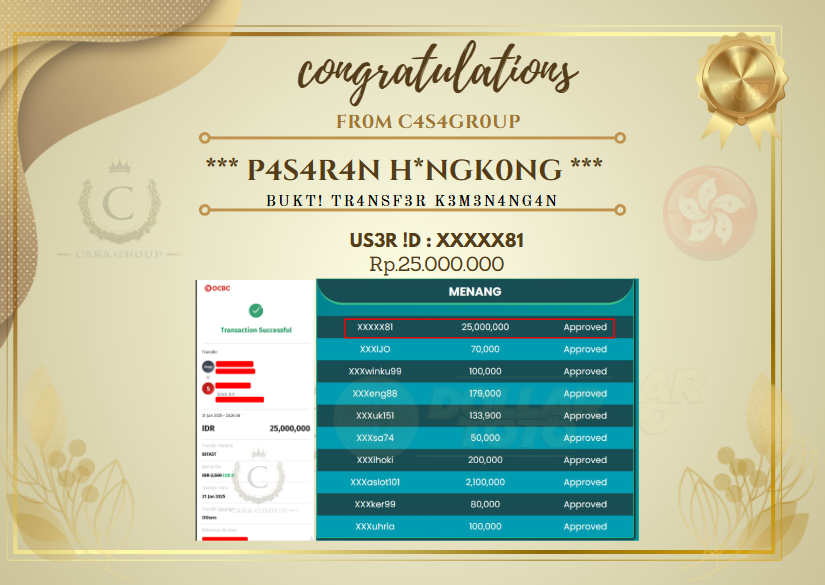 Selamat kepada User id xxxxx81 yang sudah berhasil mendapatkan jackpot besar di pasaran HONGKONG , Untuk total pencairan jackpot sebesar 25 juta langsung di bayar lunas ,
