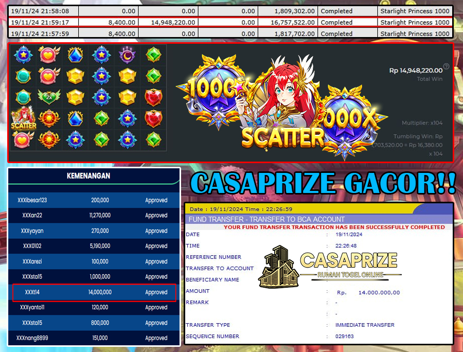 Selamat kepada bosku yang bermain di CASAPRIZE dengan user id XXXt14 yang telah mendapatkan kemenangan besar di game STAR LIGHT PRINCESS 1000 > PRAGMATIC PLAY