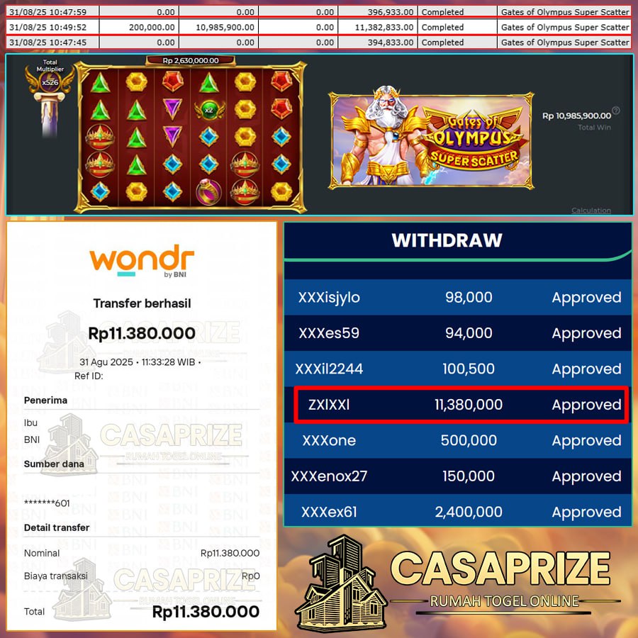 Selamat untuk Member CASAPRIZE dengan Username: ZXIXXI berhasil meraih kemenangan besar di permainan GATES OF OLYMPUS SUPER SCATTER – PRAGMATIC PLAY SLOT.
