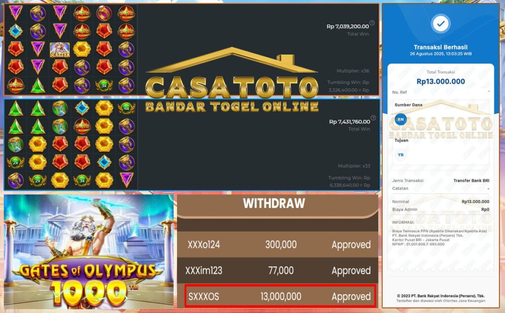 Selamat Kepada Member CASATOTO dengan User ID SXXOS Atas Kemenangan di Game GATES OF OLYMPUS 1000 – PRAGMATIC PLAY SLOT.