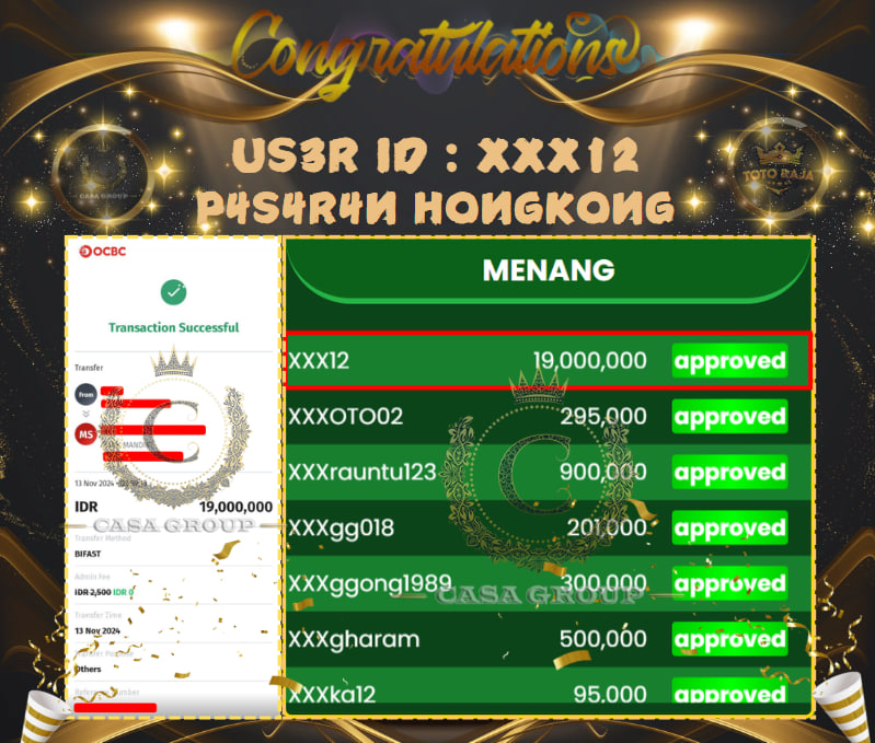 Selamat untuk User ID XXXX12 yang sudah berhasil menang di pasaran HONGKONG dengan total kemenangan mencapai 19 Juta di bayar lunas ke tujuan.