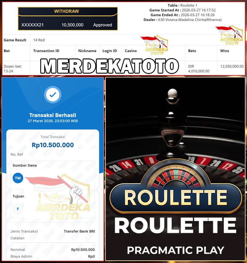 Selamat kepada bosku yang bermain di MERDEKATOTO dengan user id XXXXXX21 yang telah mendapatkan kemenangan besar di Game ROULETTE > PRAGMATIC LIVE