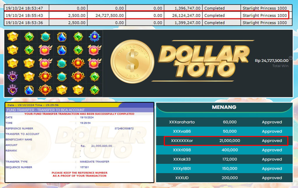 Selamat untuk User ID XXXXXXor yang berhasil JACKPOT di provider PRAGMATIC PLAY > STARLIGHT PRINCESS 1000