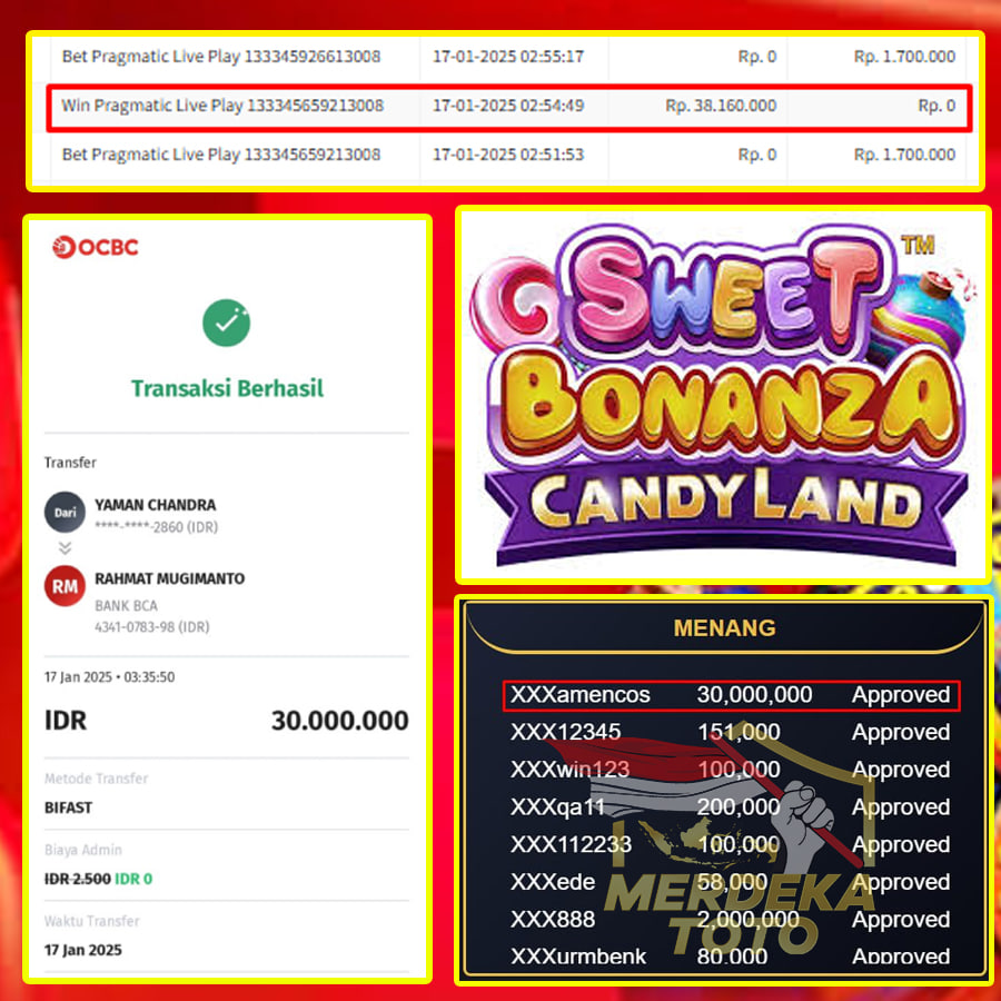 SELAMAT KEPADA MEMBER MERDEKATOTO USER ID : XXXXXXXcos , MENANG DI GAME PRAGMATIC LIVE SWEET BONANZA CANDYLAND