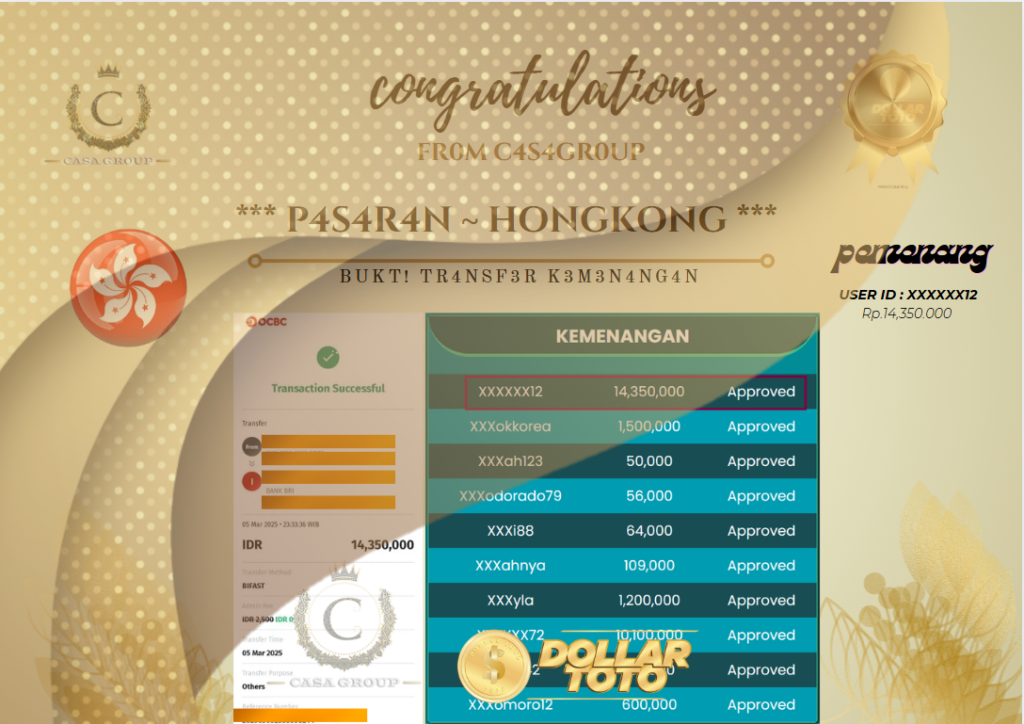 Selamat kepada User id XXXXXX12 yang sudah berhasil mendapatkan jackpot dari hasil bet di pasaran HONGKONG . Untuk total pencairan cuan kemenangan Rp.14.350.000 langsung di bayar lunas secepat kilat ,Mari gabung bersama CASAGROUP untuk mendapatkan prediksi jitu agar bisa ikut merasakan jp di pasaran hongkong .Untuk pendaftaran akun baru bisa langsung klik di sini LINK DAFTAR : CASAGROUP