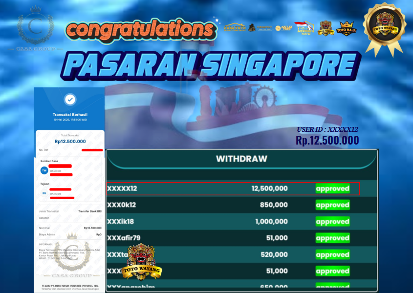 Selamat kepada User id XXXXXX12 yang sudah berhasil mendapatkan JACKPOT besar dari hasil bet pasaran SINGAPORE di situs totowayang, Dengan Total pencaiaran sebesar Rp.12.500.000 langsung di bayar LUNAS.