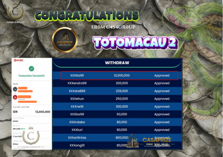 Selamat kepada User id XXXX95 yang sudah berhasil mendapatkan JACKPOT besar dari hasil bet pasaran TOTOMACAU 2 di situs casaprize dengan Total pencaiaran sebesar 12   juta langsung di bayar LUNAS,
