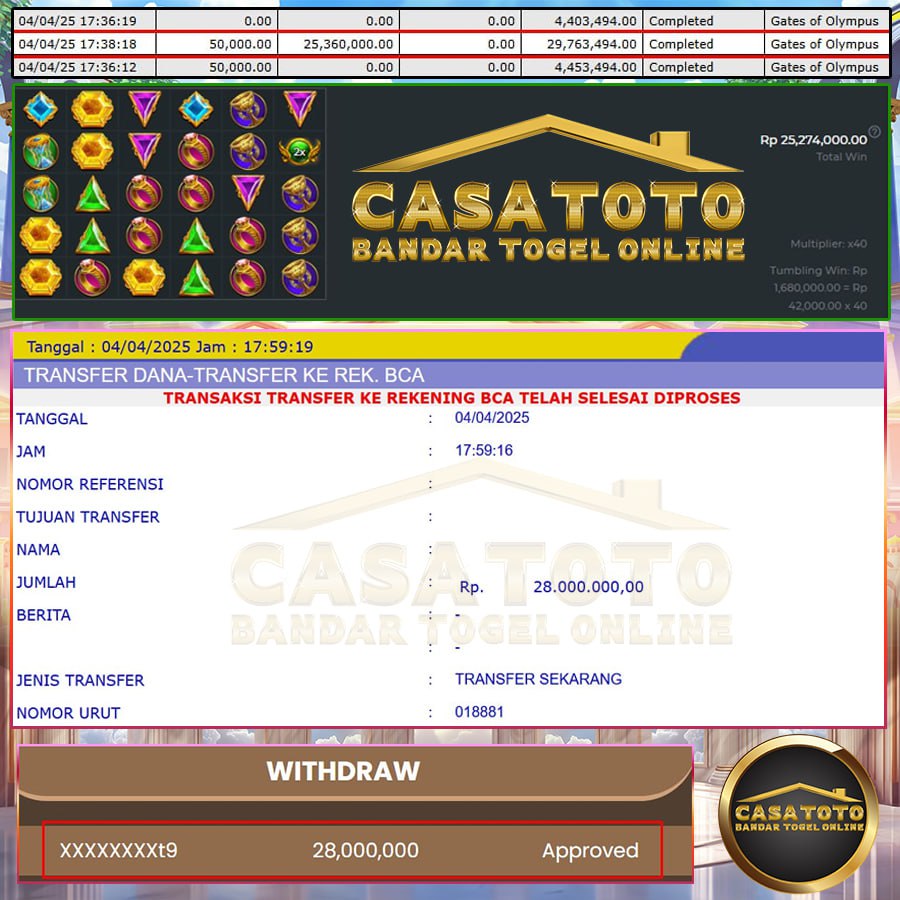 Selamat Kepada Member CASATOTO dengan Username XXXXXXXt9 Yang Beruntung Mendapatkan Kemenangan Besar di Dalam Permainan GATES OF OLYMPUS >> PRAGMATIC PLAY SLOT.