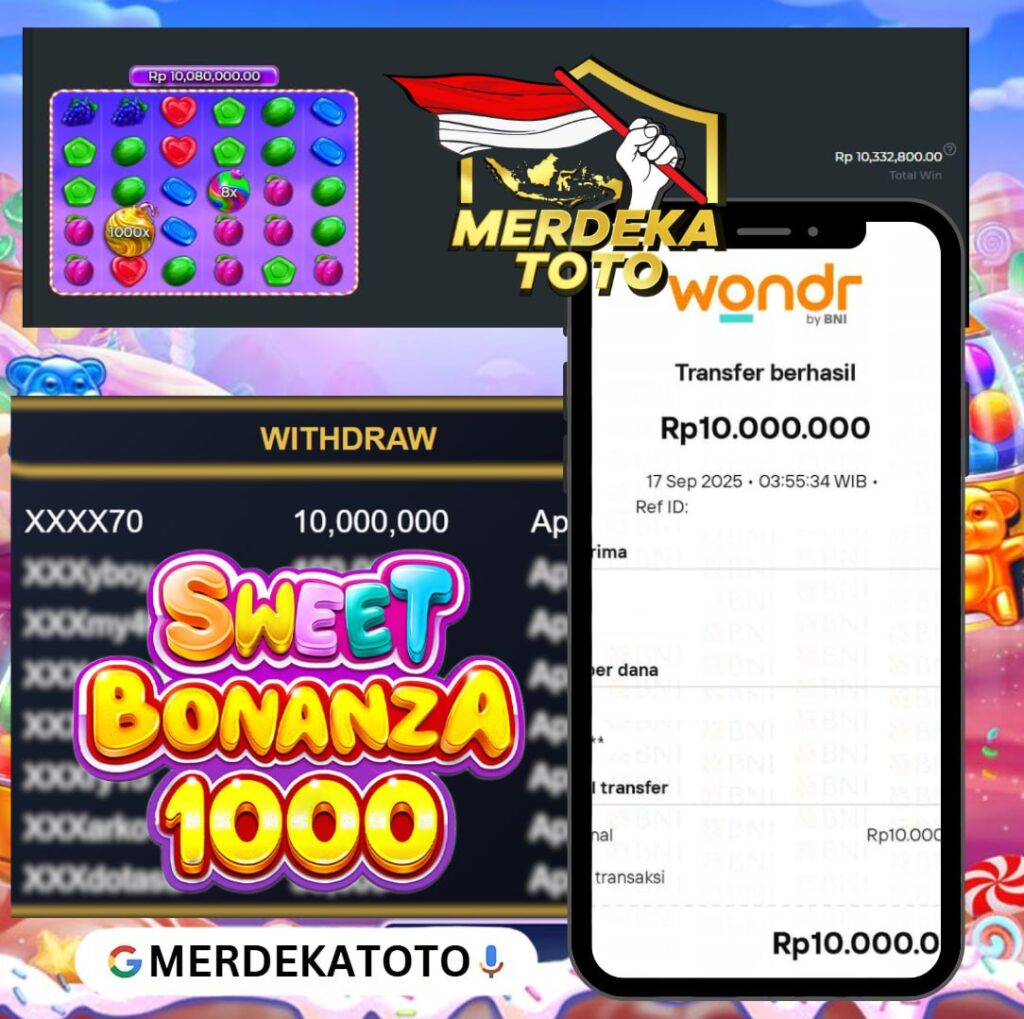 Selamat kepada member MERDEKATOTOdengan Username XXXXX7070 yang berhasil meraih kemenangan besar di permainan SWEET BONANZA 1000 – PRAGMATIC PLAY.