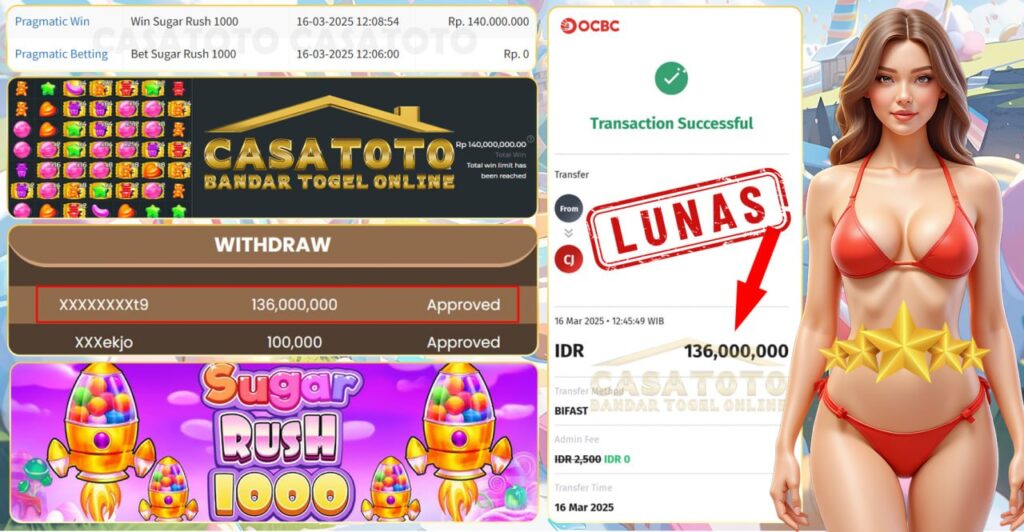 Selamat Kepada Member CASATOTO dengan Username XXXXXXXt9 Yang Beruntung Mendapatkan Kemenangan Besar di CASATOTO Dalam Permainan SUGAR RUSH 1000 >> PRAGMATIC PLAY SLOT.